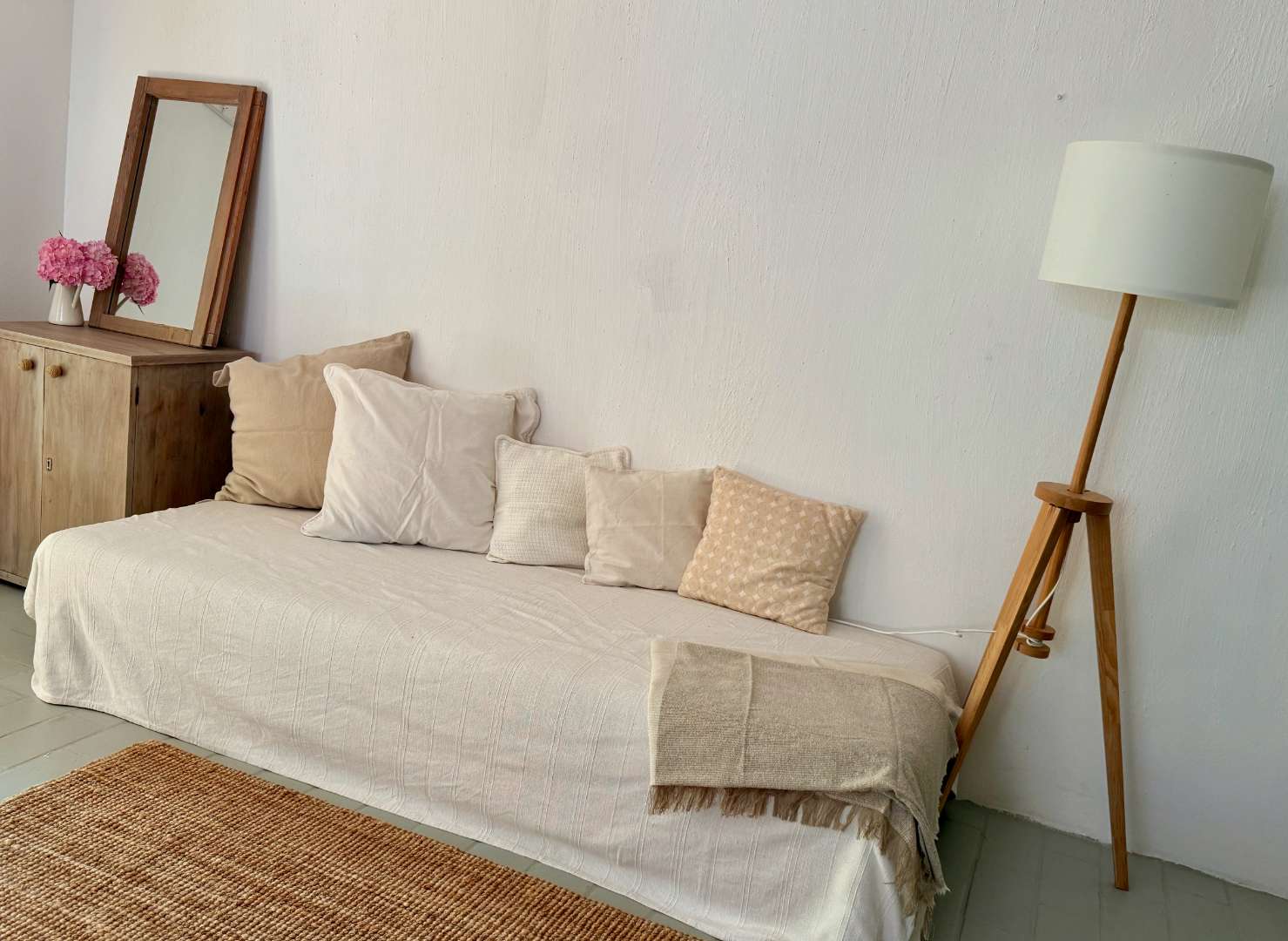 A nappaliban található kanapé szükség esetén pótágyként is használható. A földszinten került kialakításra a zuhanyzóval és wc-vel ellátott fürdőszoba is.