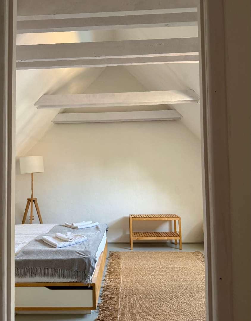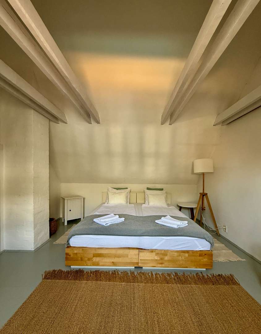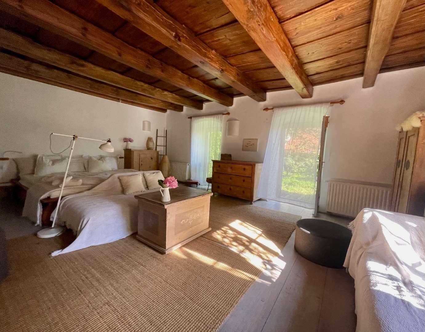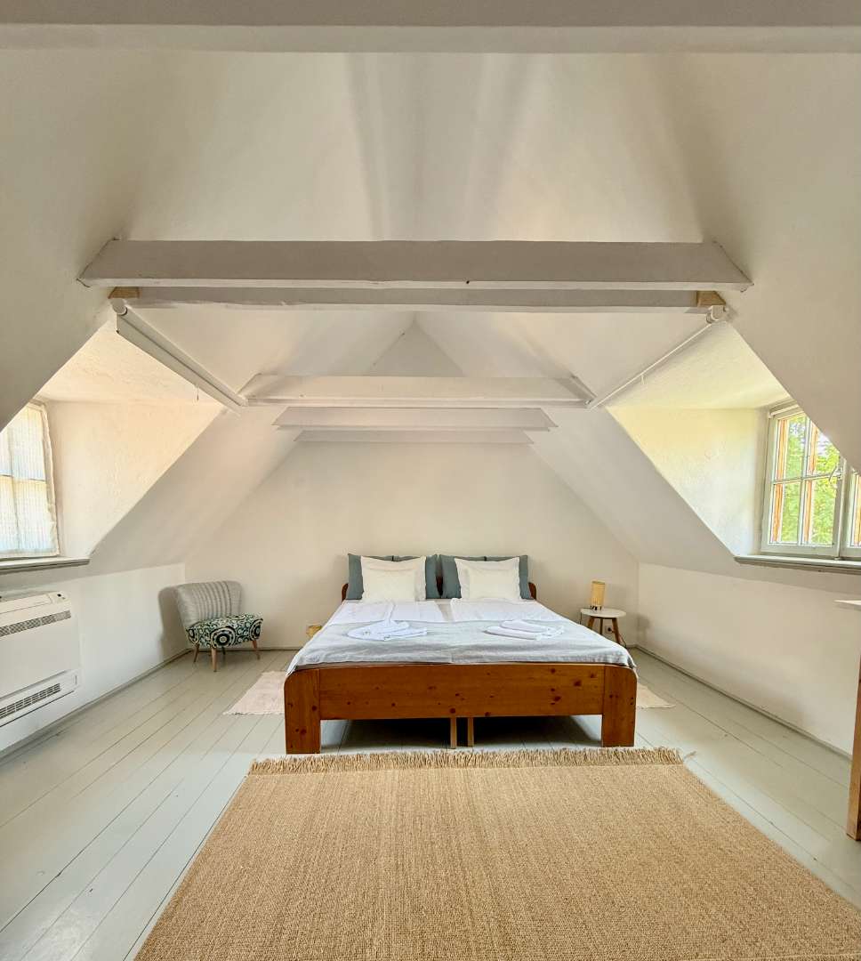 A nagy közös kertre és a saját kiskertre néző szobában egy franciaágy, valamint egy pótágyként is használható, nagy fekvőfelülettel rendelkező pad is található.