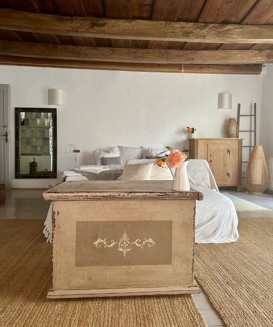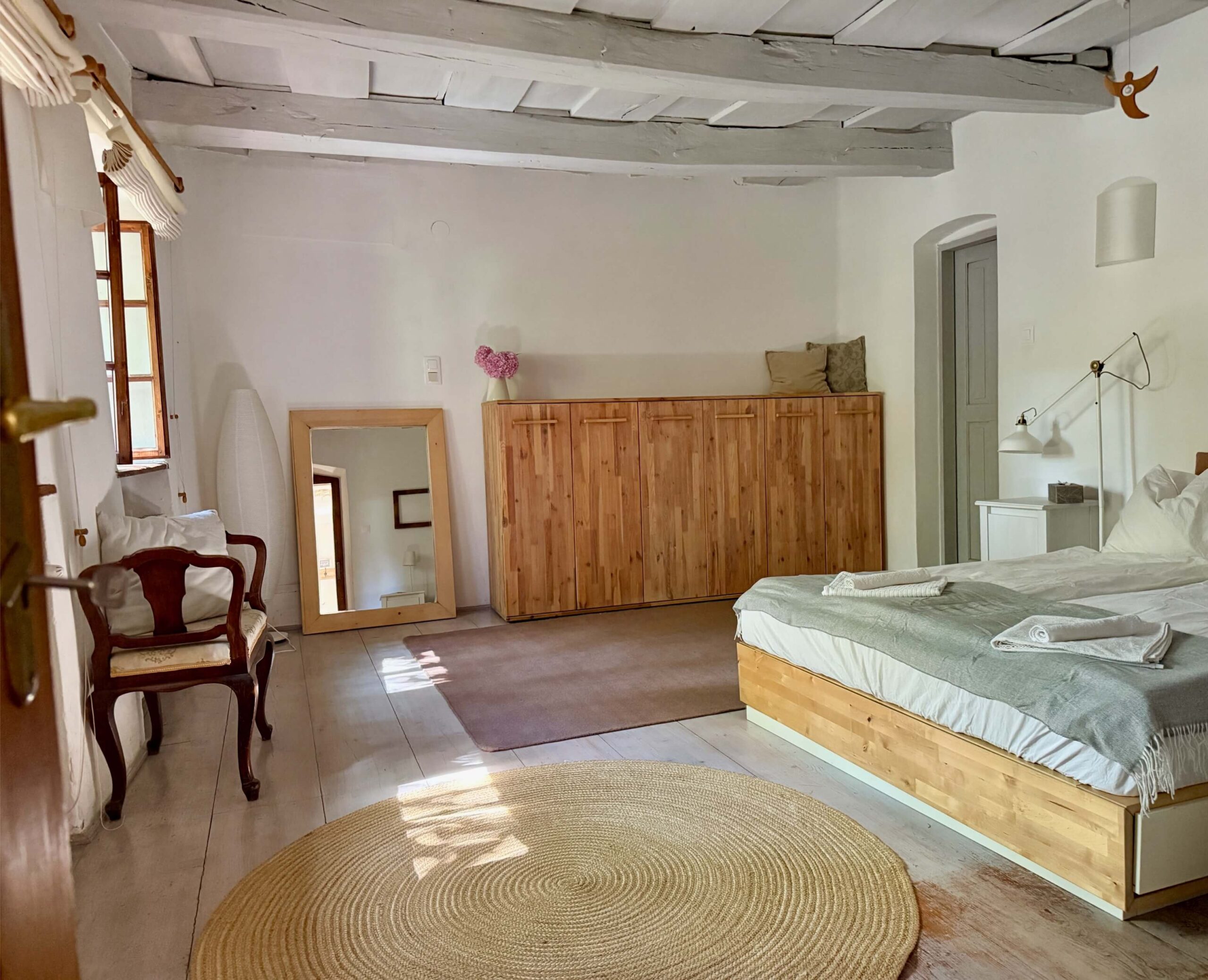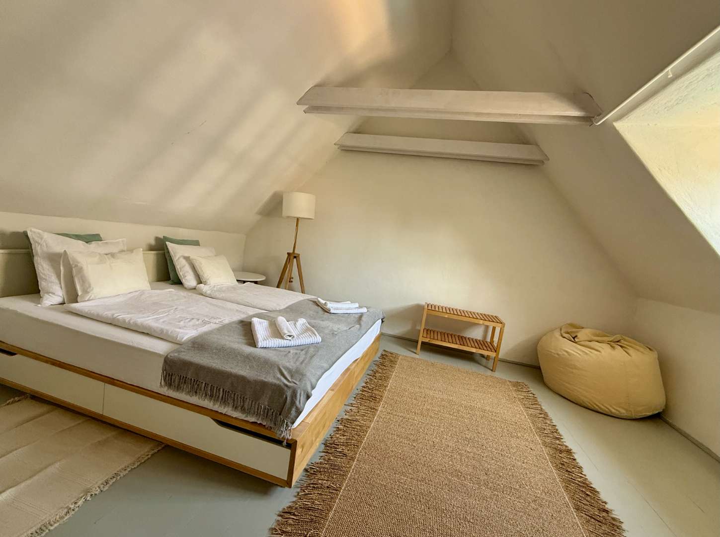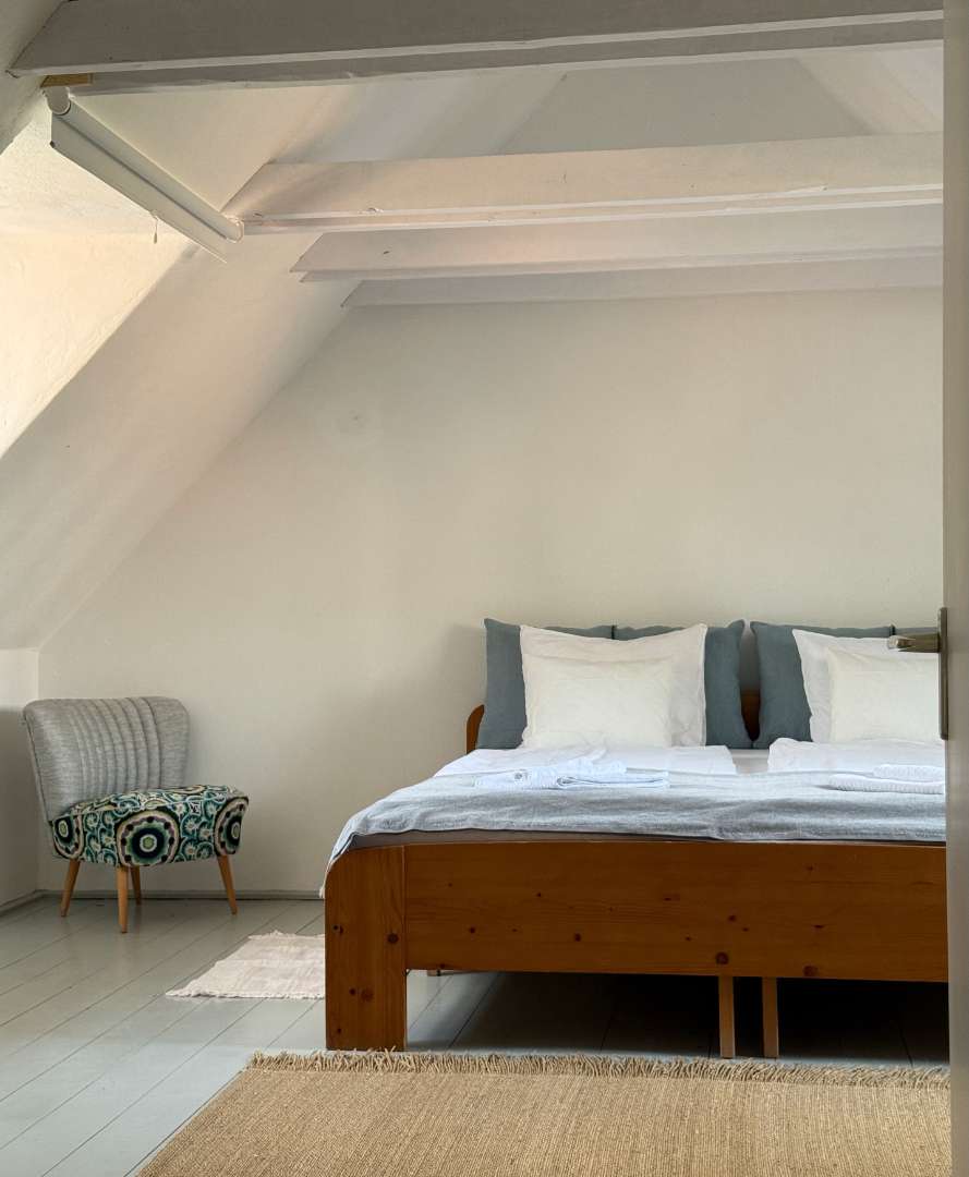 A nagy közös kertre és a saját kiskertre néző szobában egy franciaágy, valamint egy pótágyként is használható, nagy fekvőfelülettel rendelkező pad is található.
