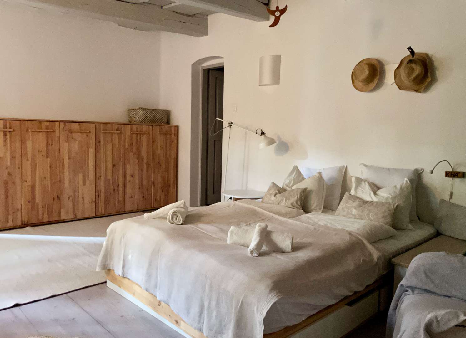 Az emeleten található két hálószobában nagy méretű, kényelmes franciaágyak találhatók. Az emeleti hálószobákhoz egy meglehetősen meredek lépcső vezet, ezért kisgyermekek csak felügyelettel, idősebb vendégek pedig kellő körültekintéssel használják.