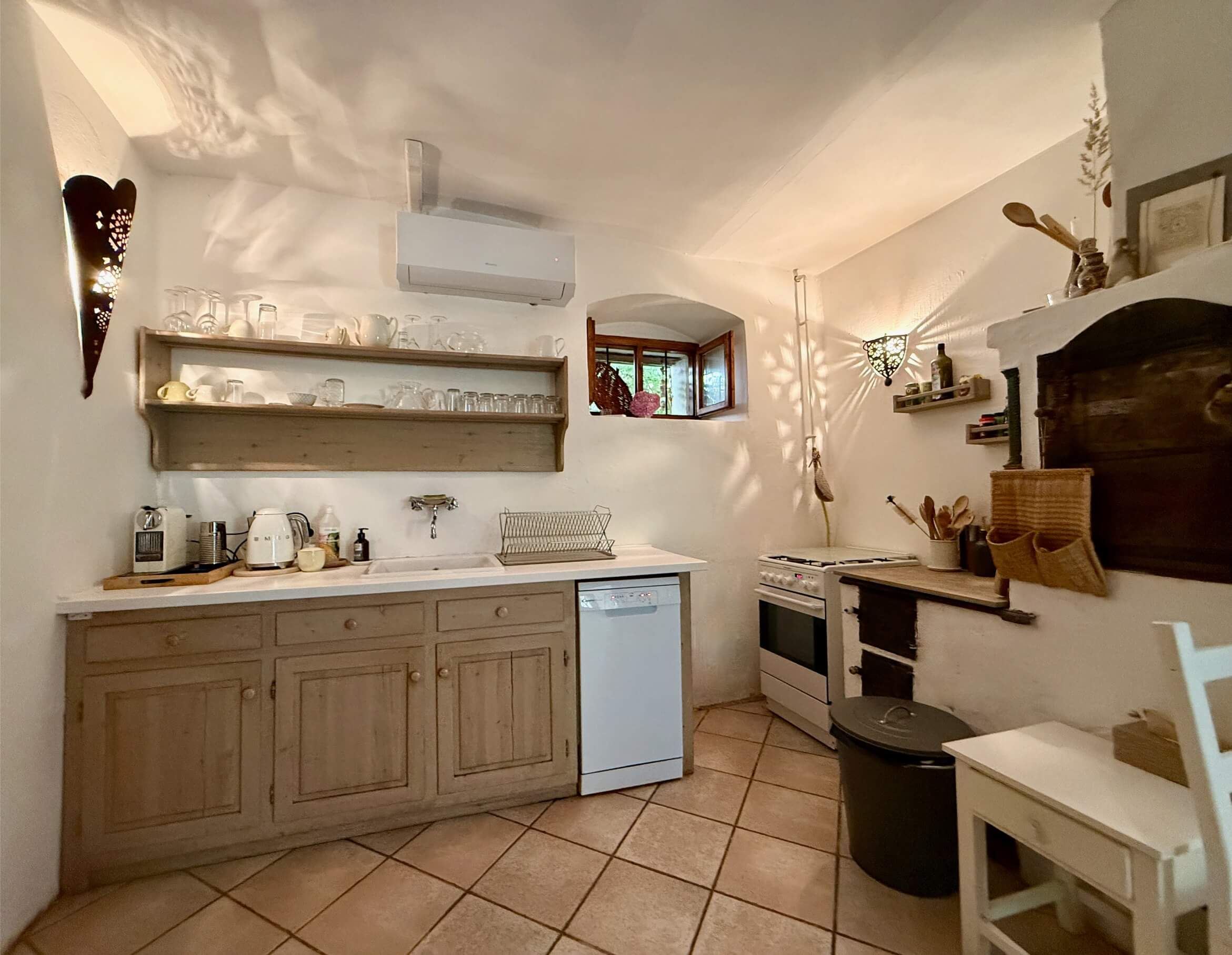 A földszinten kapott helyet a tágas, amerikai konyhás nappali. A teljesen felszerelt konyhában villanytűzhely, hűtőszekrény, vízforraló, Nespresso kapszulás kávéfőző és tejhabosító is rendelkezésre áll.