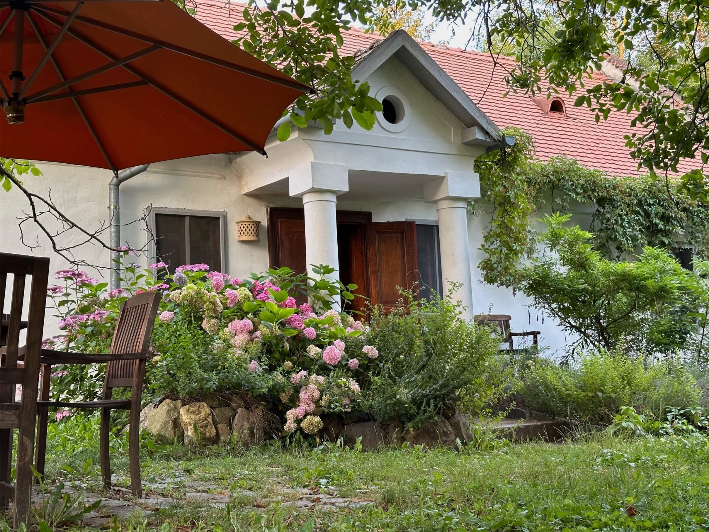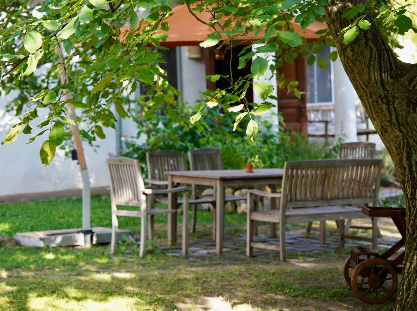 Az Alkony házhoz tartozik egy külön étkezőasztal közvetlenül a ház előtt, a diófa árnyékában ahol nyugodtan többen is körbe tudjátok ülni a nagy asztalt.
