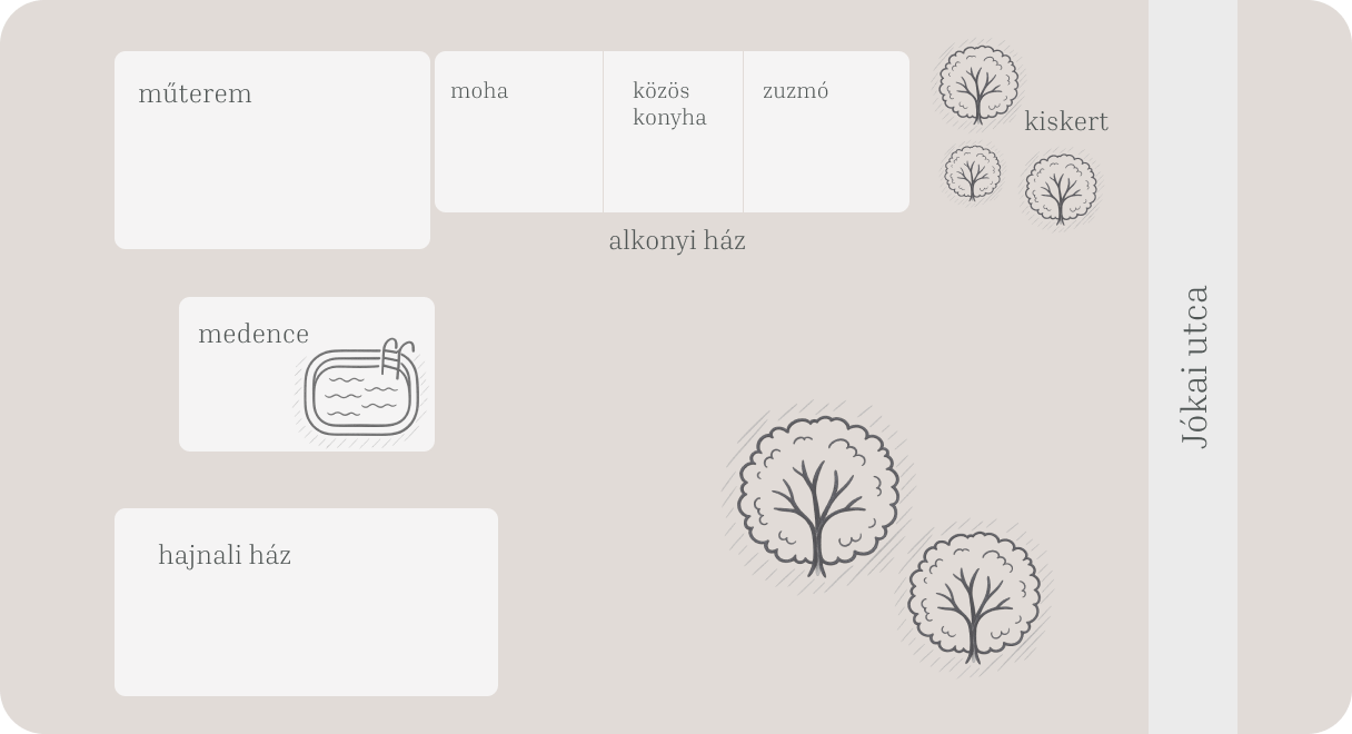 A Moha lakrész a ház bal oldalán található és nevét a belső kertre néző szoba zöld cserépkályhája ihlette.